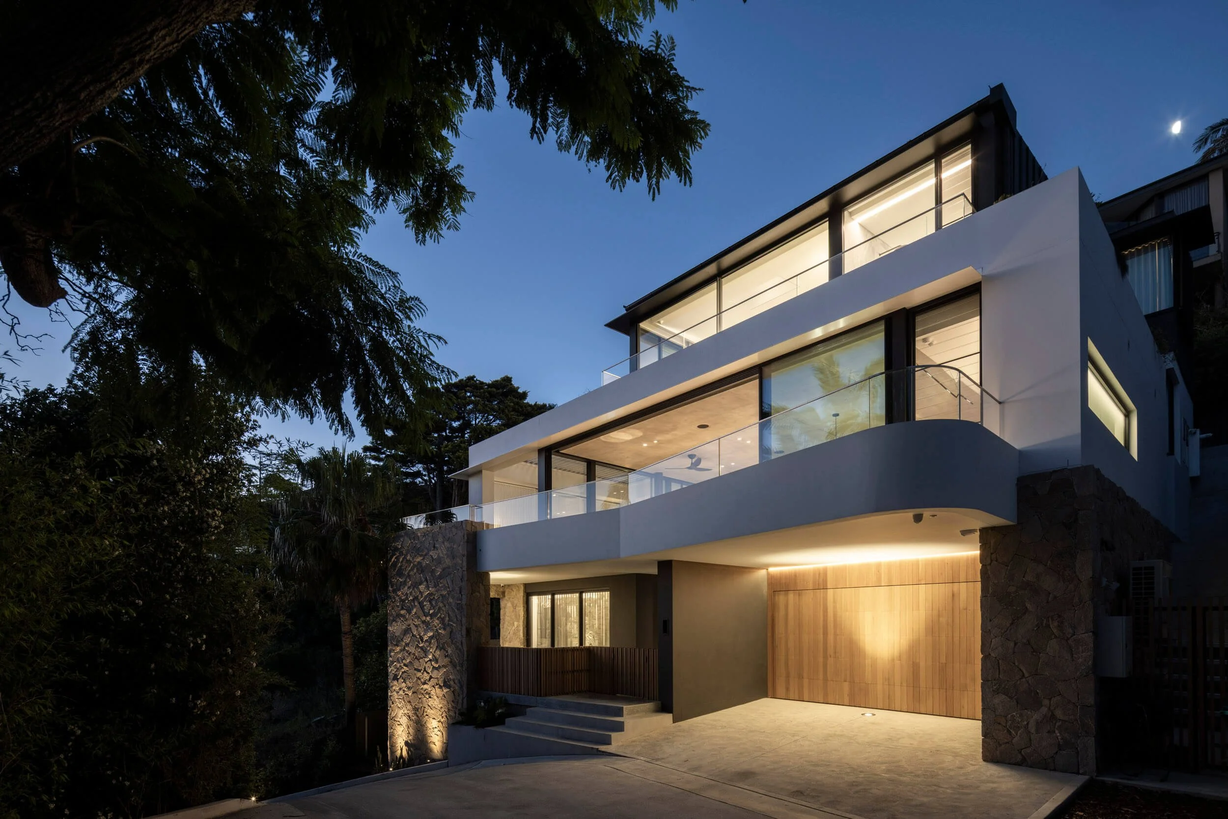 Tucked into the Seaforth slopes, this architectural masterpiece by Watershed Architects is the ultimate contemporary family home. We were engaged to design, detail and specify and procure all the architectural and decorative lighting elements. There were many ceiling challenges, with concrete in the living and dining areas, raked in the kid’s bedrooms and gyprock with minimal clearance. The beautiful rock wall cladding and timber lent themselves to uplighting, bringing them to life at night.